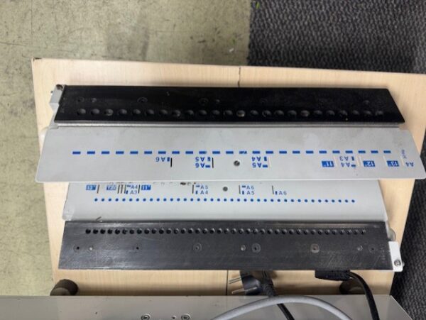 Papierponsapparaat met 3 verschillende verwisselbare ponsblokken.