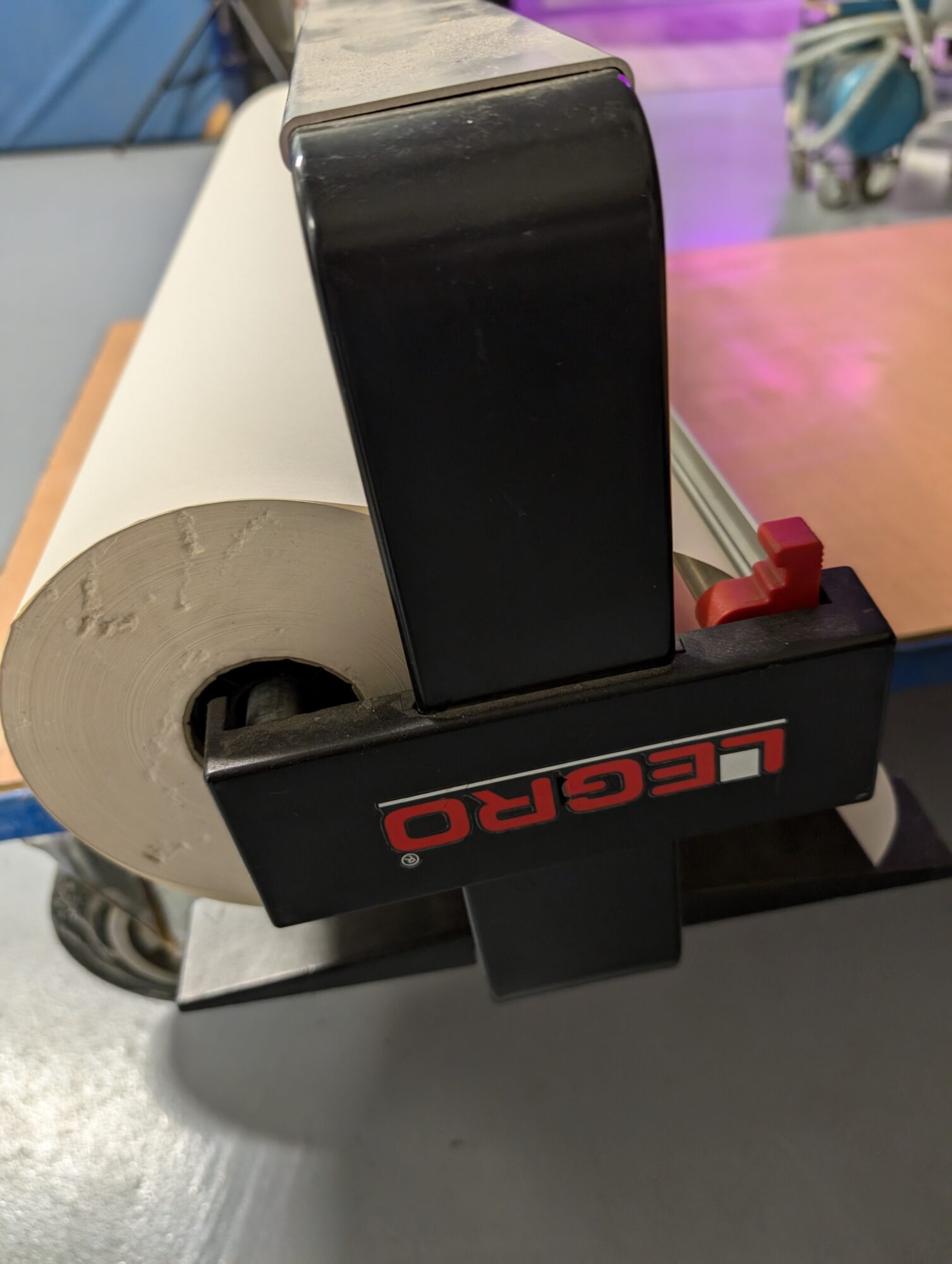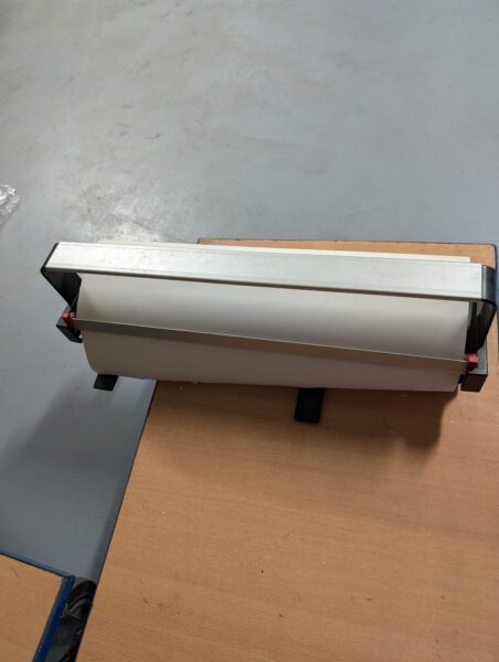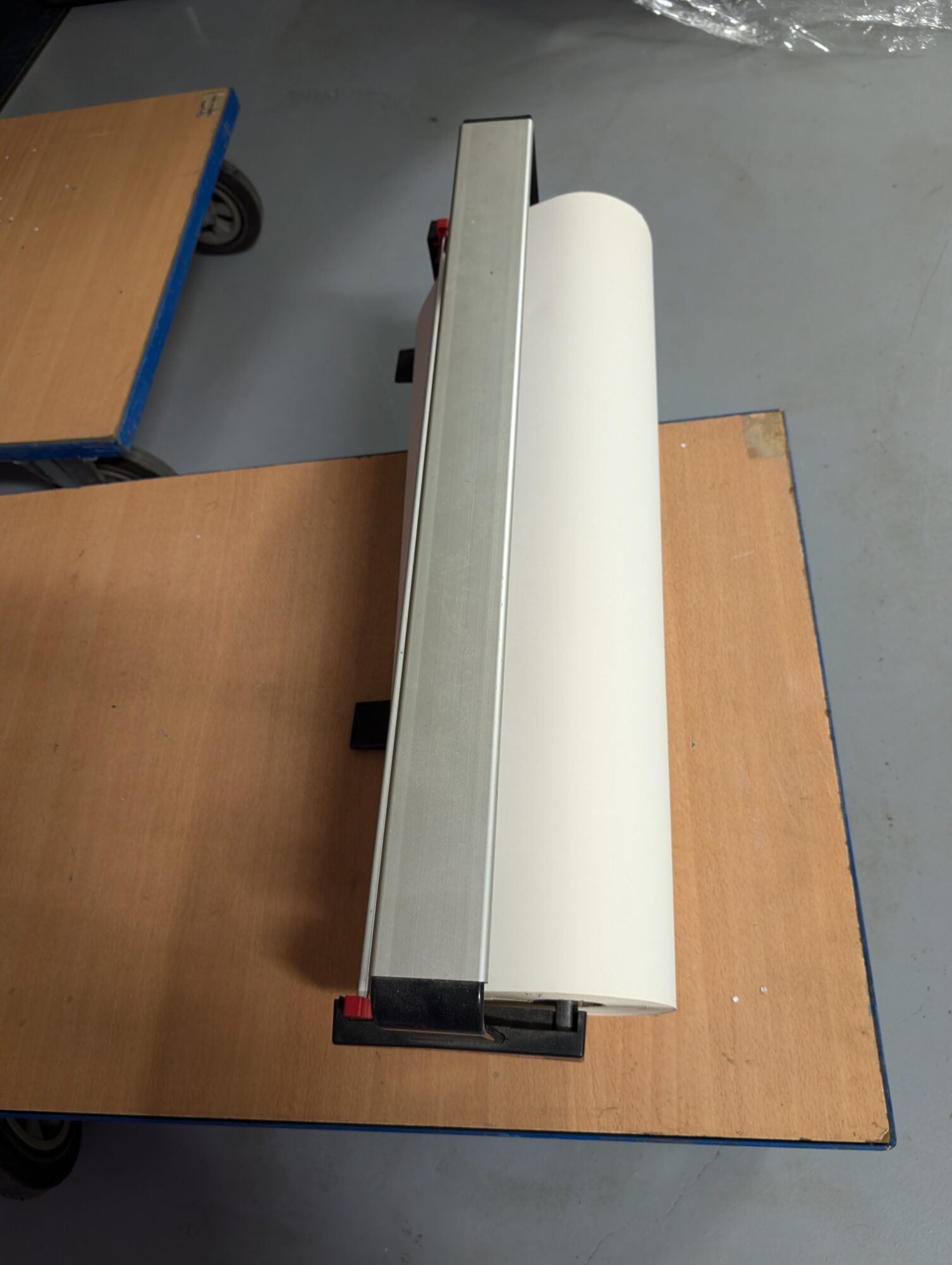 Papierafroller voor inpakken Met rol papier erop Breedte is 75 cm.