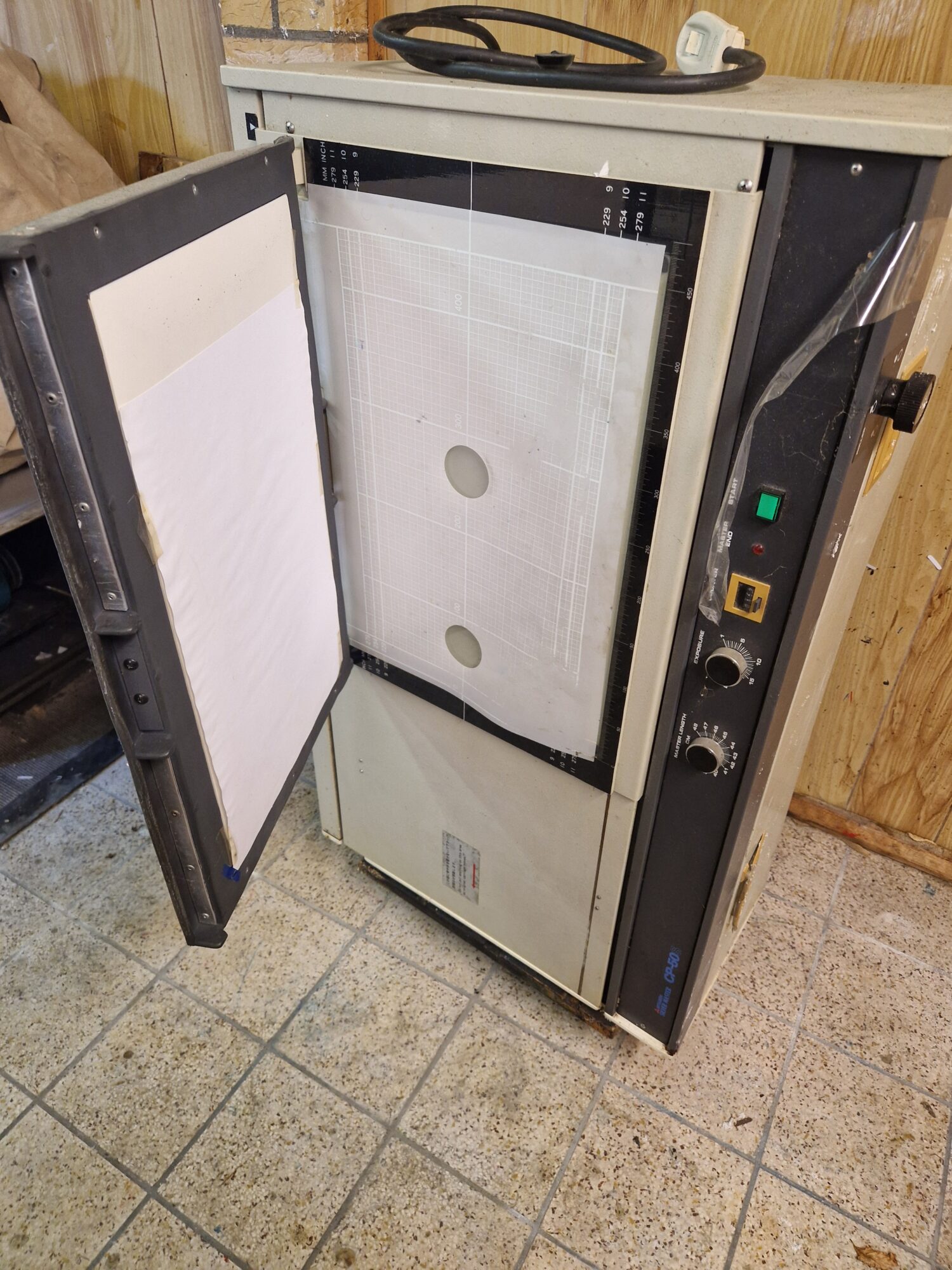Platenmaker met een rol blanco plaat. Op de foto staat de platenmaker op zijn kant.
