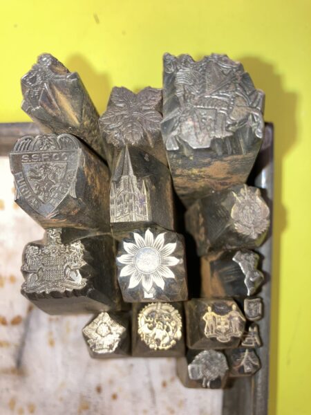Wie weet waar deze ponsen voor gediend hebben? Het lijkt erop of ze zijn gebruikt voor het aanbrengen van bladgoud, maar voor zover ik weet wordt daar toch subtieler gereedschap voor gebruikt. Het zijn 16 stuks met zeer uiteenlopende afbeeldingen.