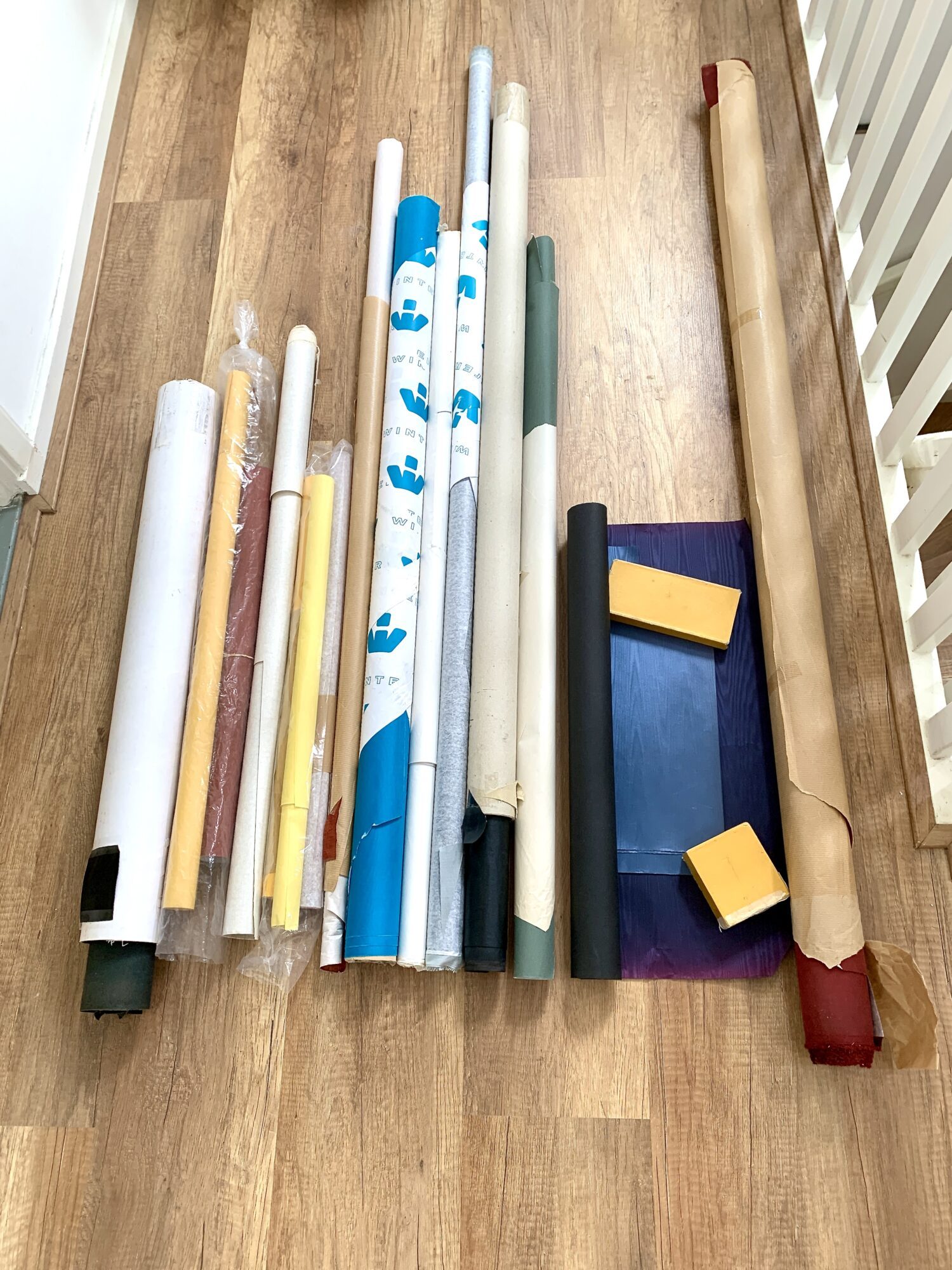 Meerdere kleuren en soorten aangebroken rollen boekbinderslinnen.