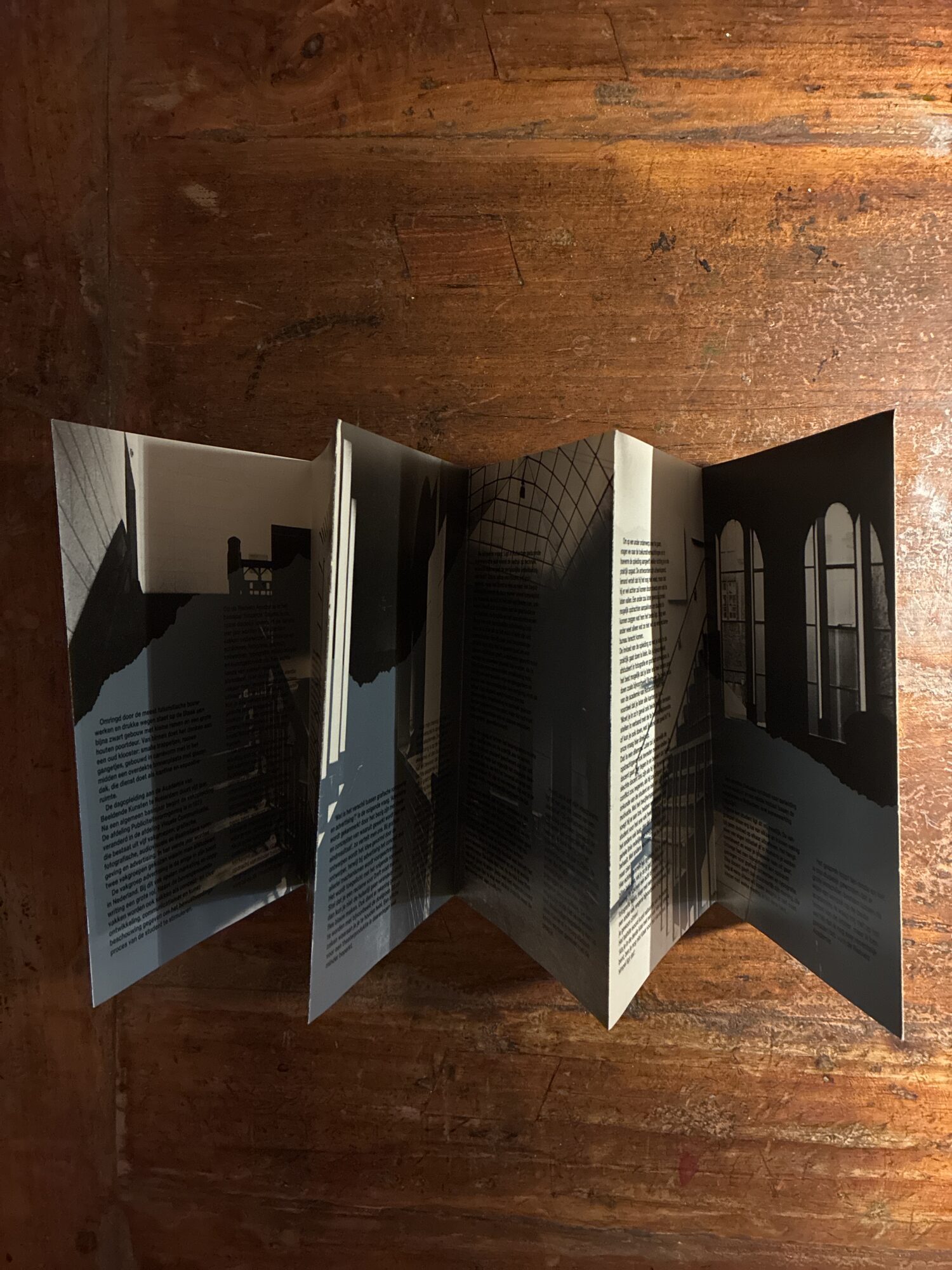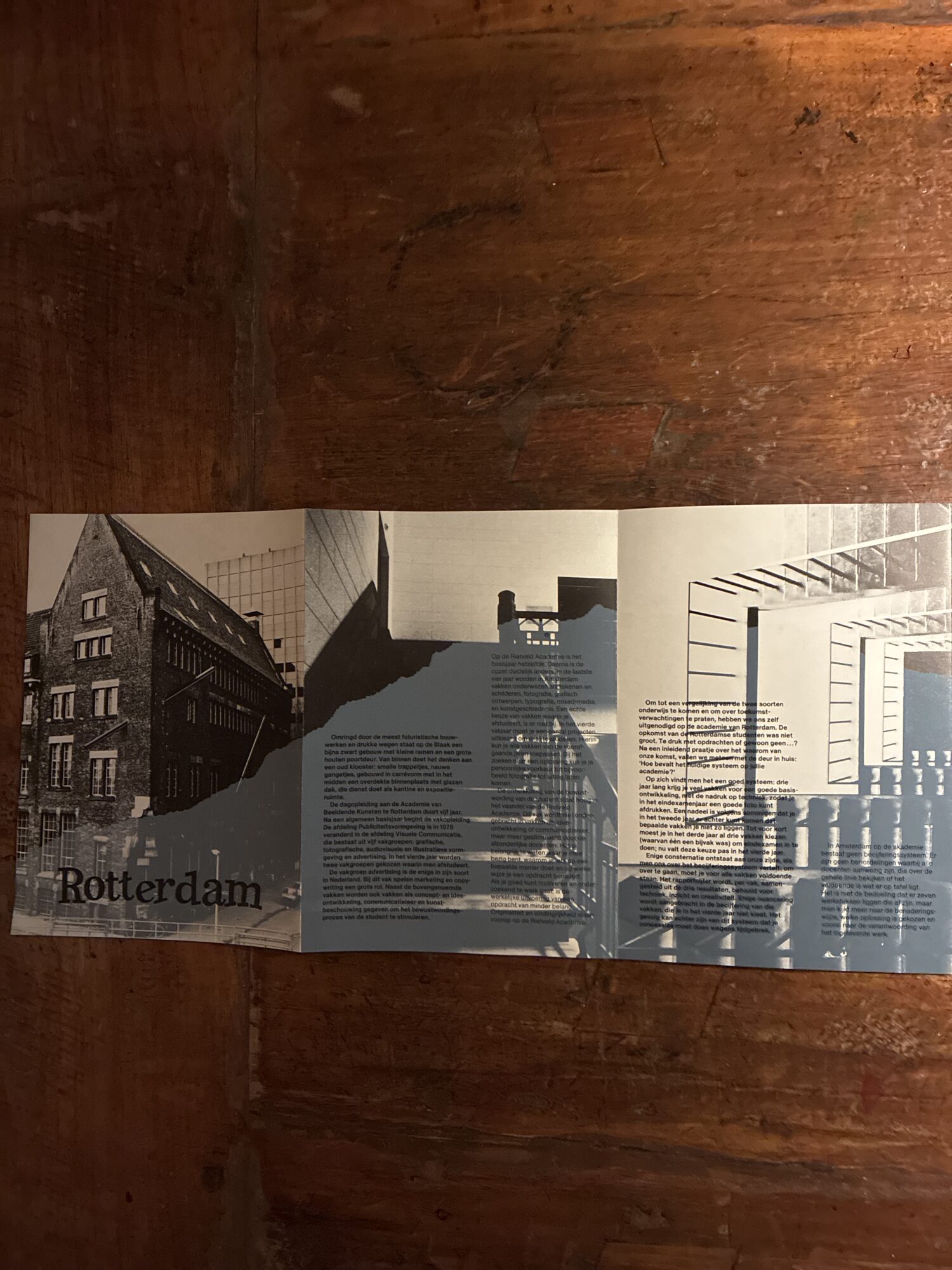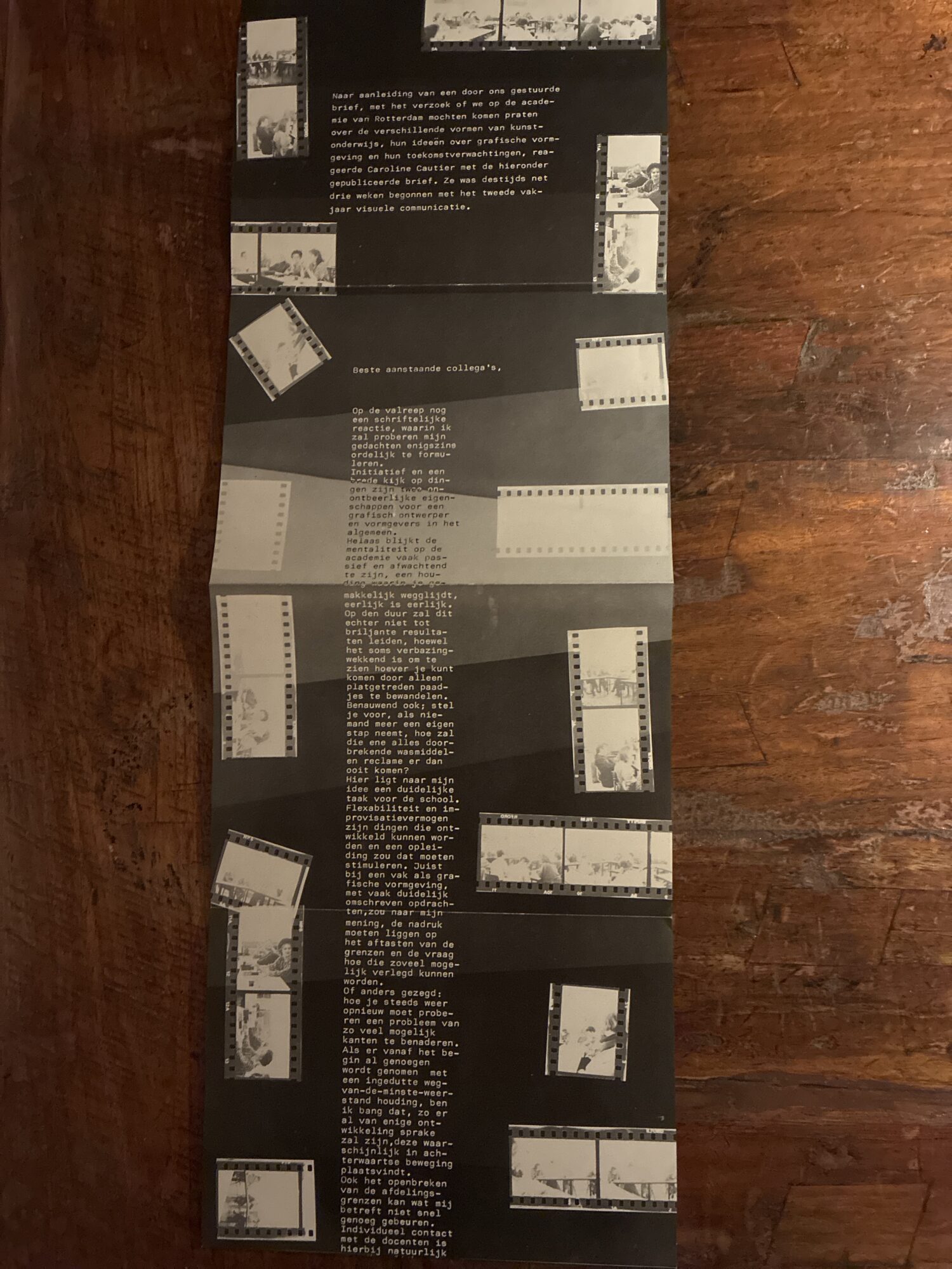 Brochure over de verschillen tussen opleidingen (grafische) vormgeving aan de kunstacademies in Rotterdam en Amsterdam, de Academie van Beeldende Kunsten te Rotterdam en de Rietveld Academie in Amsterdam. In een doorlopende tekst op deze als leporello vormgegeven brochure worden beide opleidingen met elkaar vergeleken; aan de ommezijde is een brief afgedrukt van een student van.de academie in Rotterdam aan haar Amsterdamse collega’s
