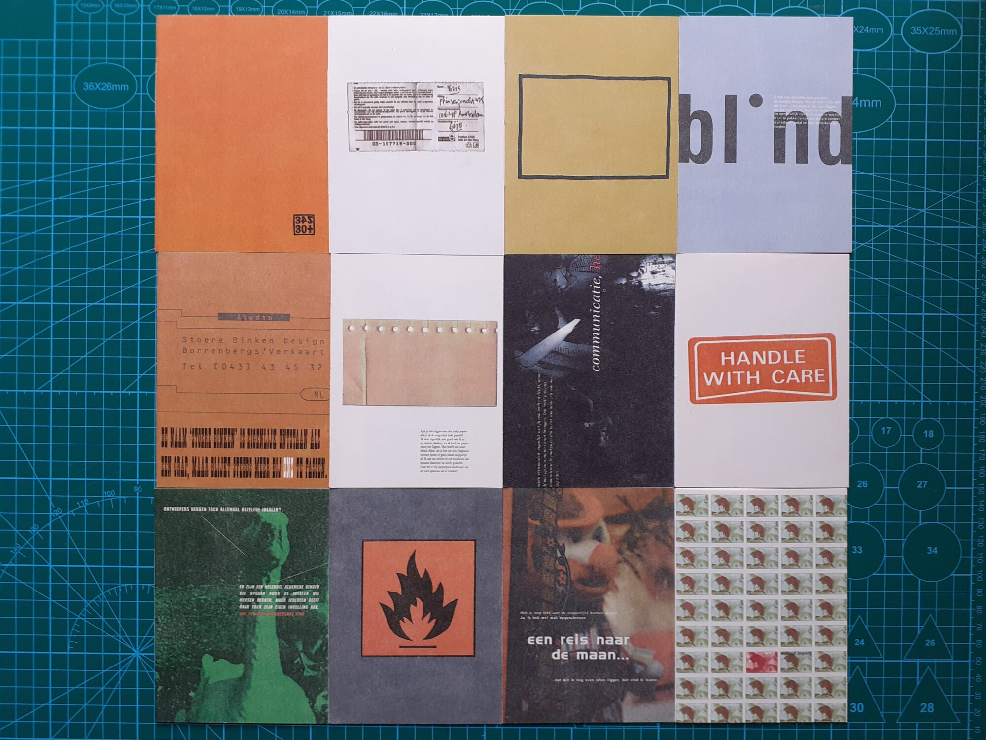 Set van 12 boekjes “Idealen” – afstudeerproject van Patrick Keeler (Minerva, 1995). Set van 12 geniete boekjes (elk 12 pag., offset, formaat 10 × 14 cm) met gesprekken met 12 studenten grafisch ontwerp van 12 kunstacademies.