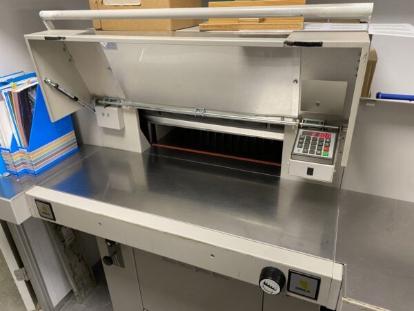 Snijmachine EBA 550 met zijtafels, 1 reservemes en snijlijsten. Snijbreedte 55 cm. 220 volt op wielen en vastzetpoten. Beschermkap en kwartseconde knoppen. Meswisselaar houder en informatieboekje.
