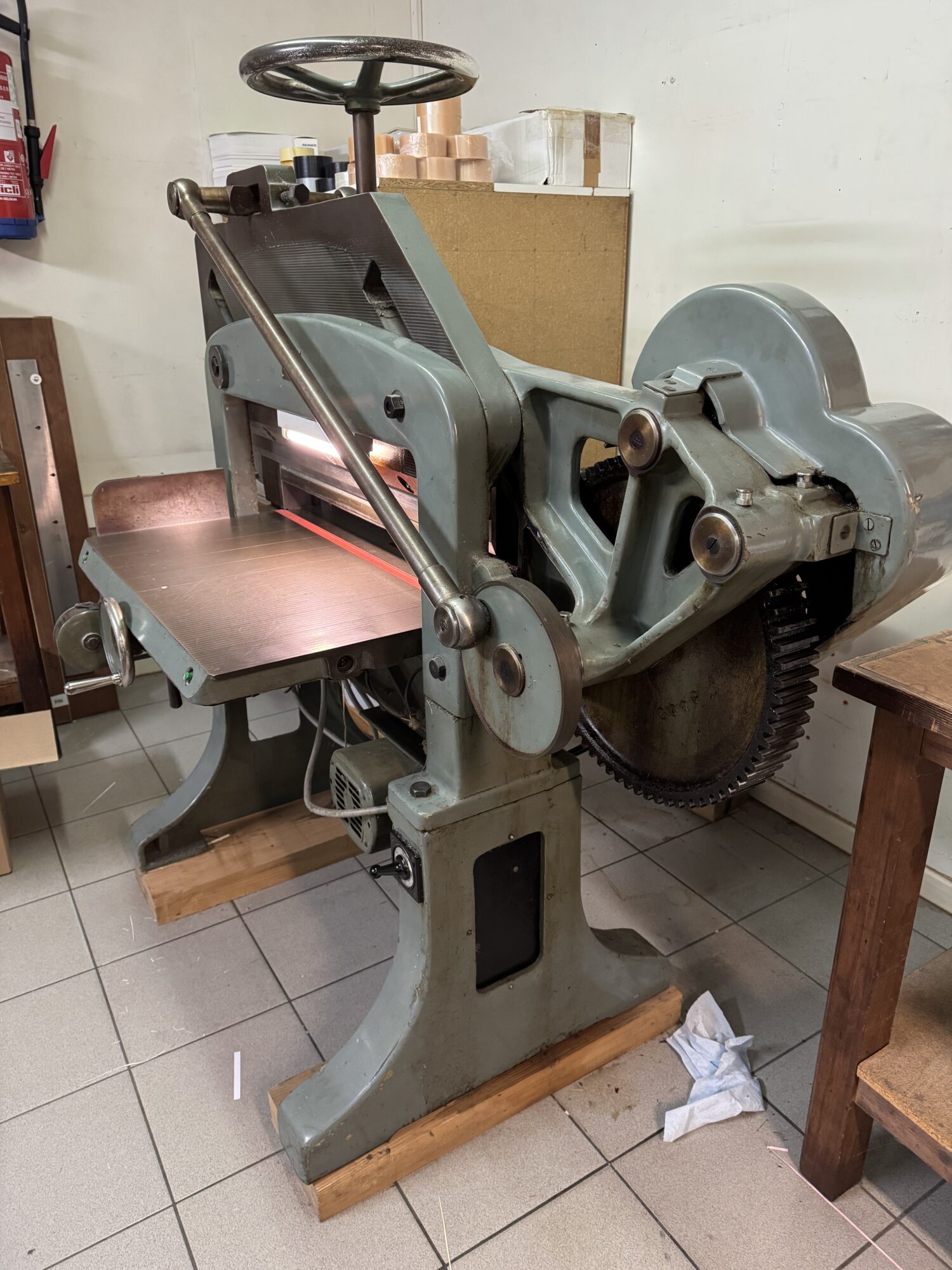 Robuuste, degelijke snijmachine te koop. Electrisch aangedreven – voorzien van 2 nieuwe messen en vele snijlatjes – in werking te bezichtigen – gedeeltelijk demonteerbaar – prijs overeen te komen