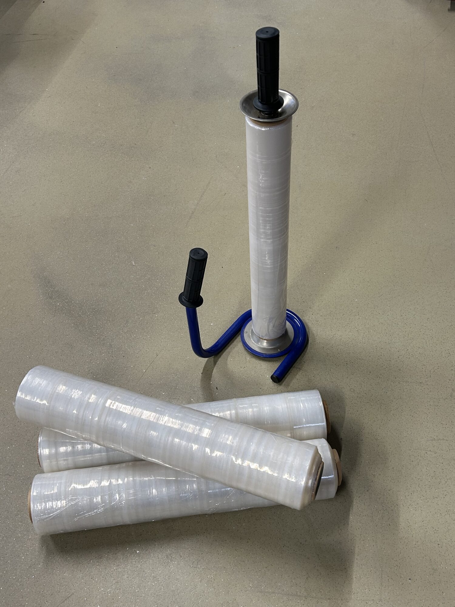 Stretchfoliedispenser, metaal, blauw 3 rollen PE-Stretchfolie, transparant, 500 mm (breed) × 300 M – Super