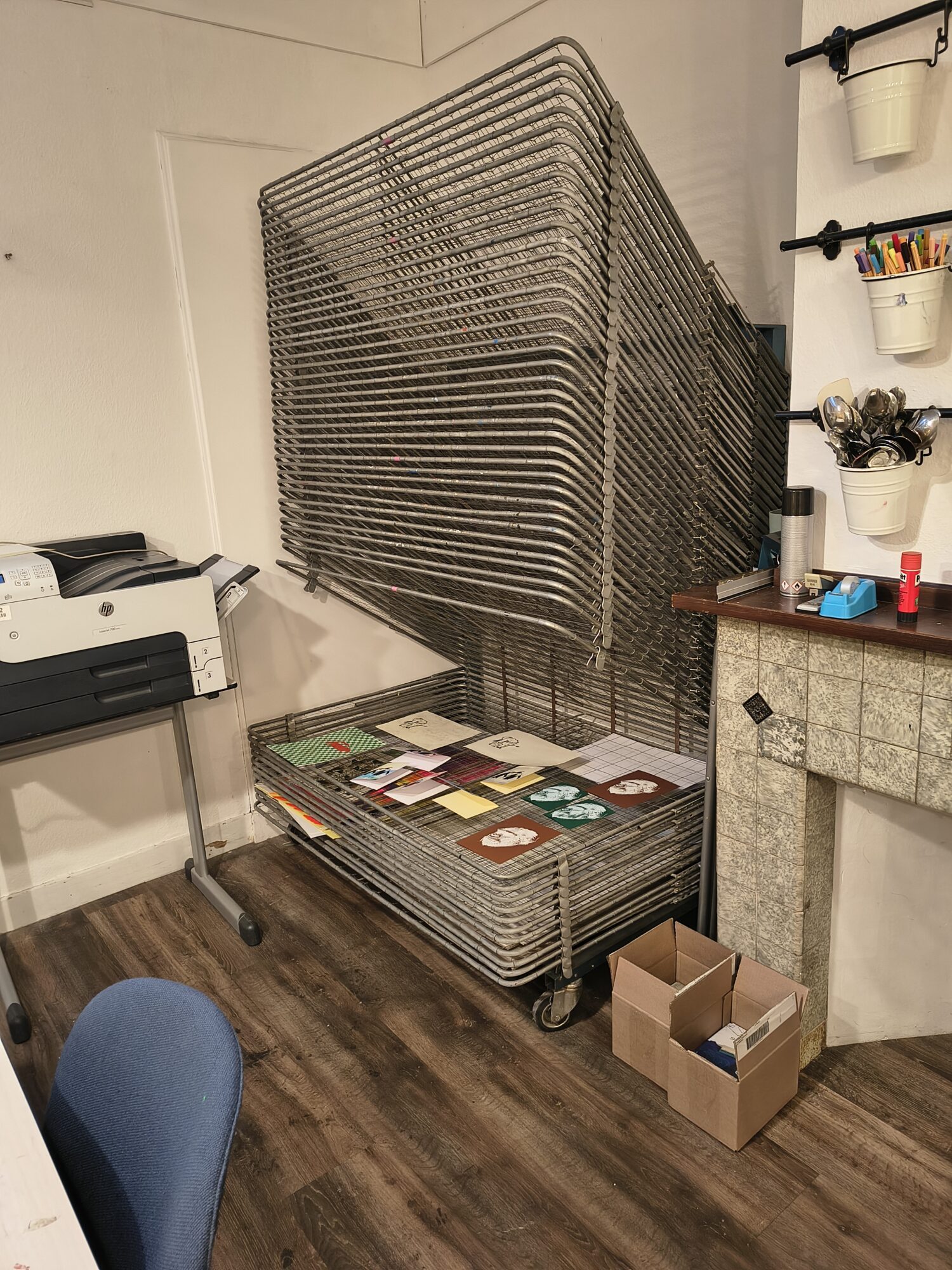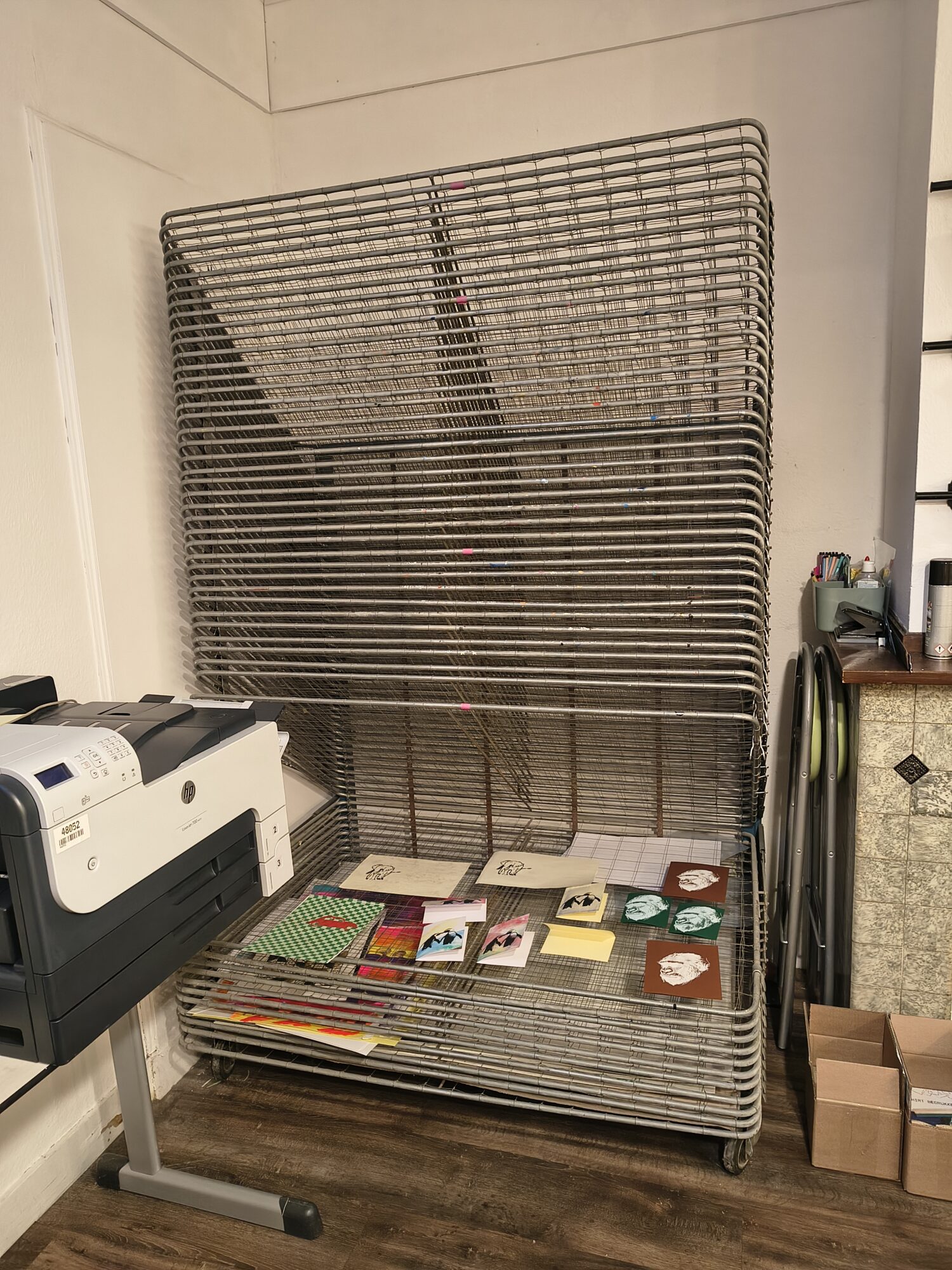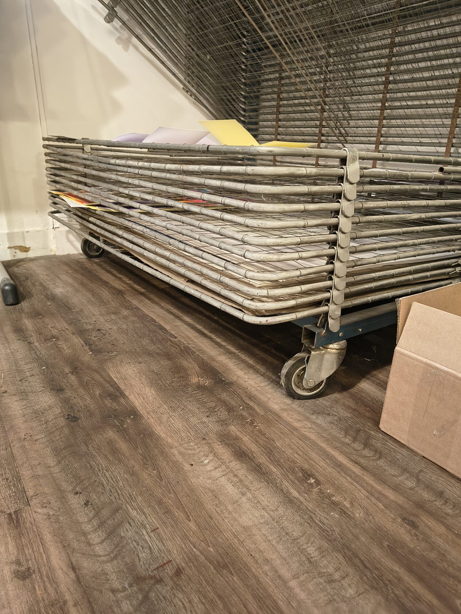 Ik verkoop een ruim en stevig papierdroogrek op wielen, perfect voor een atelier, drukkerij of creatieve werkruimte waar veel wordt gewerkt met nat papier, drukwerk of schilderingen. Het rek rolt soepel, klapt eenvoudig uit en biedt veel droogruimte per blad.