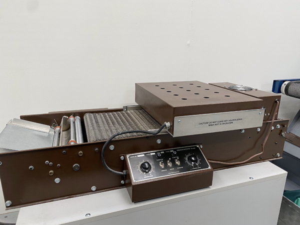 Machine poedert en verhit. Het poeder blijft aan de natte inkt plakken, de droogtunnel zorgt ervoor dat het harspoeder smelt waardoor een opdikkend spot-UV effect ontstaat.