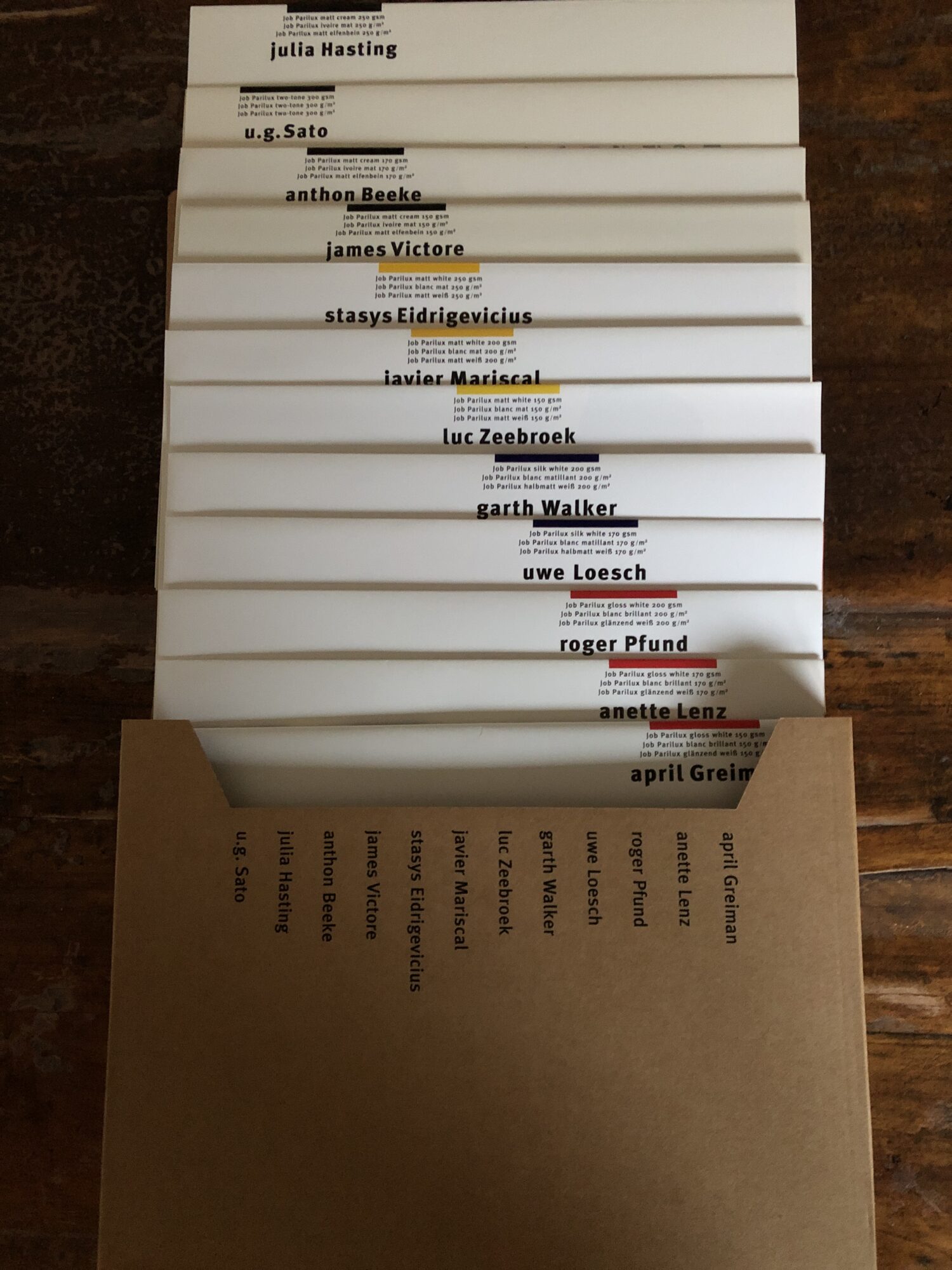 Doos met twaalf bijdragen van kunstenaars en vormgevers, afgedrukt op verschillende soorten papier van Job Parilux van Grafisch Papier/Scheufelen, alle in de vorm van grote uitklapbladen, waarop onder meer biografieën van de deelnemende kunstenaars en vormgevers