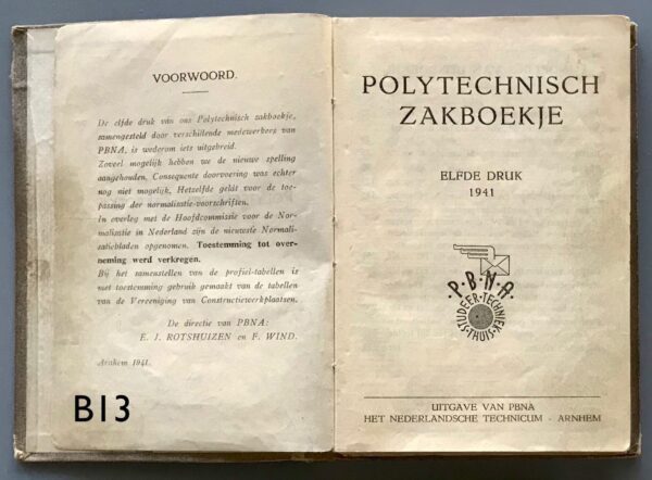 01 Het Polytechnisch Zakboek van 1941, de 11e druk, is een uitgebreide technische gids met tabellen, grafieken en schema’s, oorspronkelijk uitgegeven door PBNA en Het Nederlandsche Technicum in Arnhem. Het boek is een ouderwets zakboekformaat van en bevat informatie voor diverse technische disciplines.