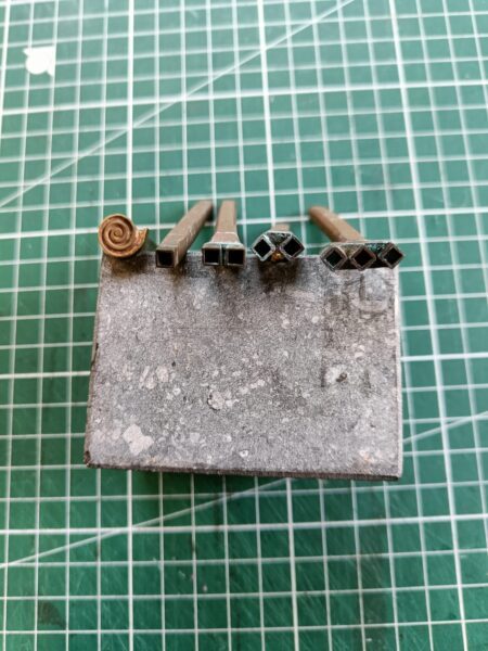 Een vijftal verguldstempels met een geometrisch patroon. Voor het vergulden van boekbanden of -ruggen.