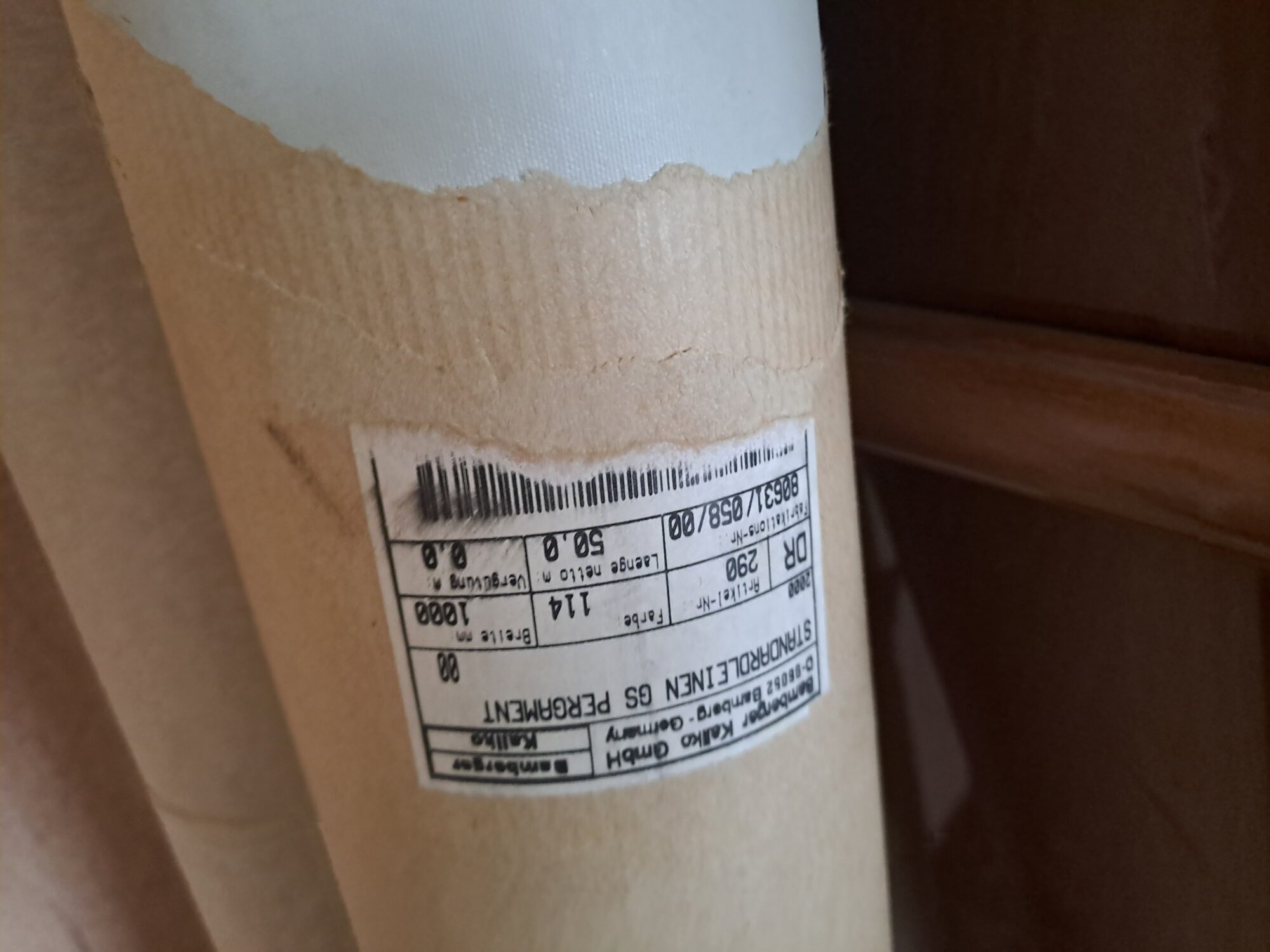 De rol is nog volledig (zie etiket) 1 m breed, 50 m lang. Kleur: pargamom