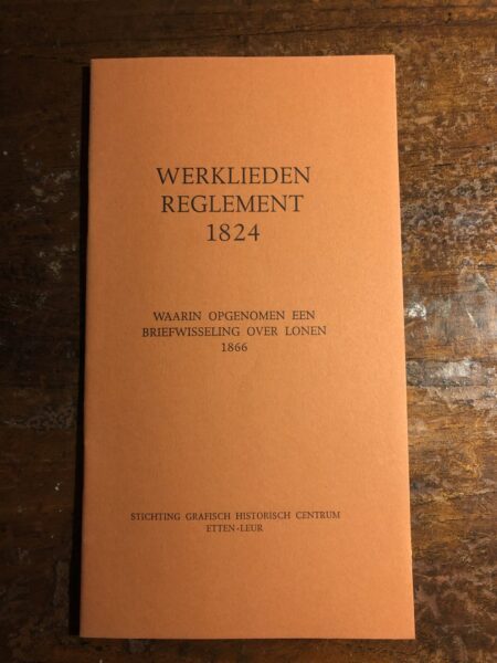 Overdruk van een ‘Werkliedenreglement [uit] 1824’, aangevuld met een tweetal brieven uit 1866 betreffende loonkwesties, in december 1989 door de Stichting Grafisch Historisch Centrum te Etten-Leur heruitgegeven.