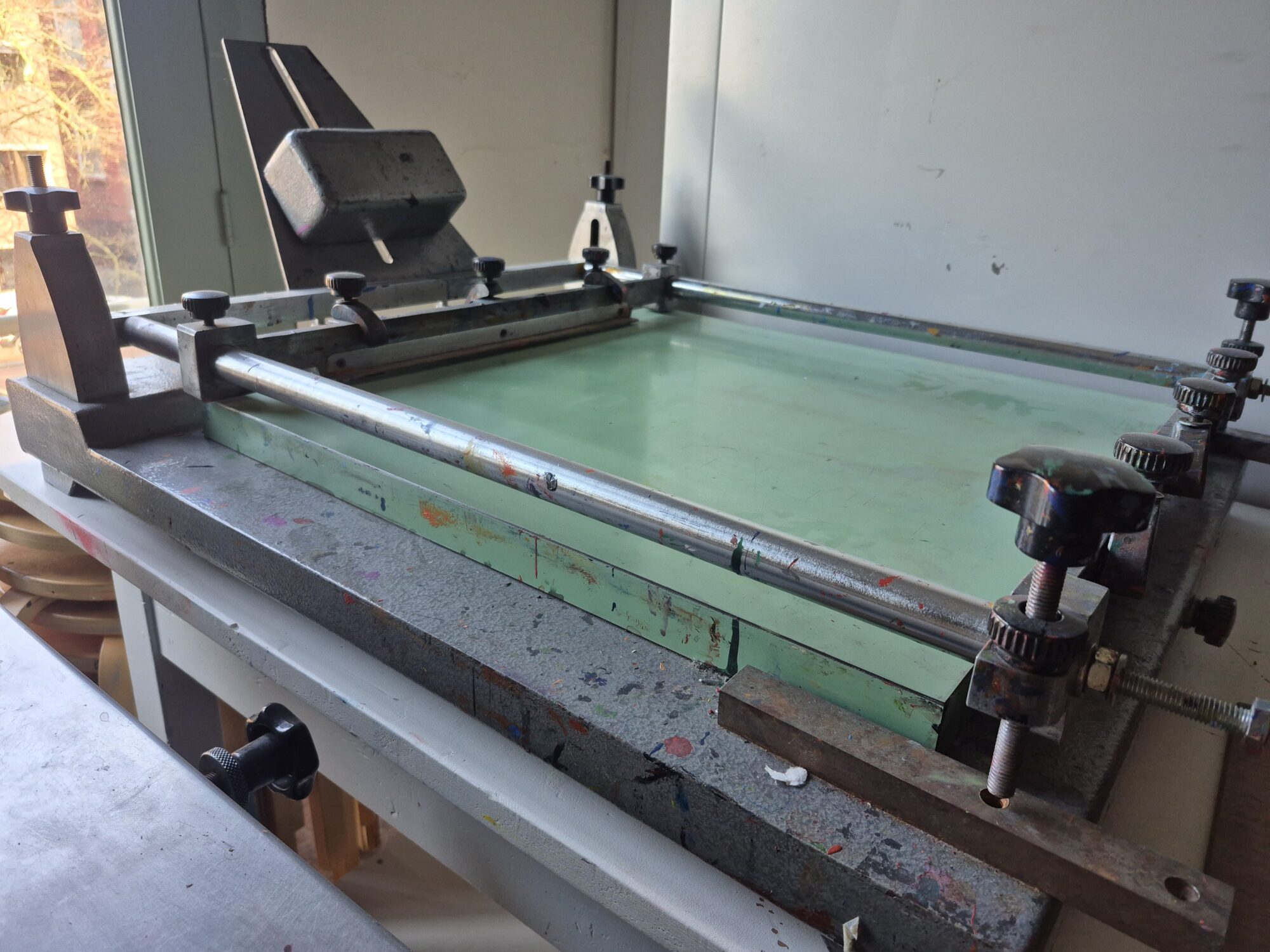 Handige zeefdruktafel die op een tafel geplaatst worden. Kan staand opgeruimd worden, minder ruimte nodig.